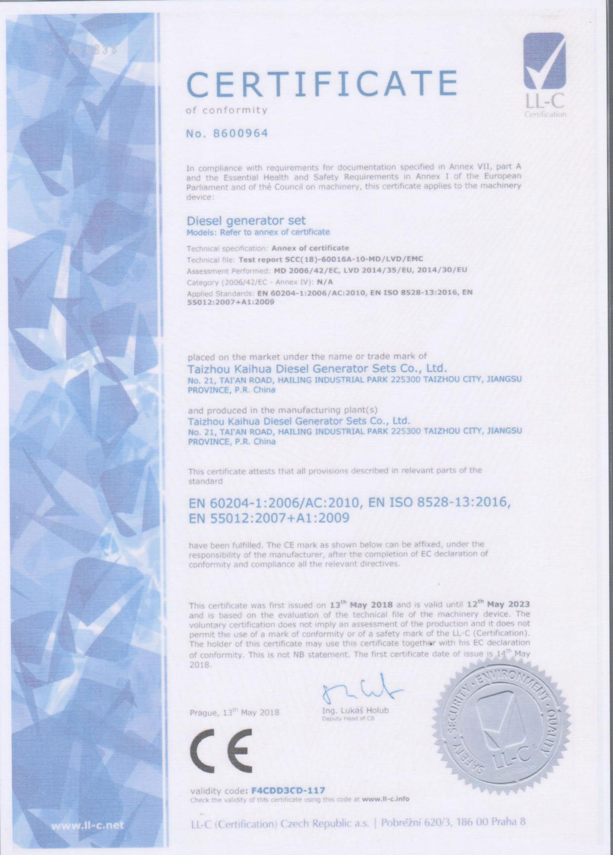 發(fā)電機組廠家凱華公司已先后通過ISO9001質量認證、泰爾認證、ISO14001-2001環(huán)境管理體系認證、GB/T28001-2001職業(yè)健康安全管理體系認證,歐盟CE認證、SGS認證等。